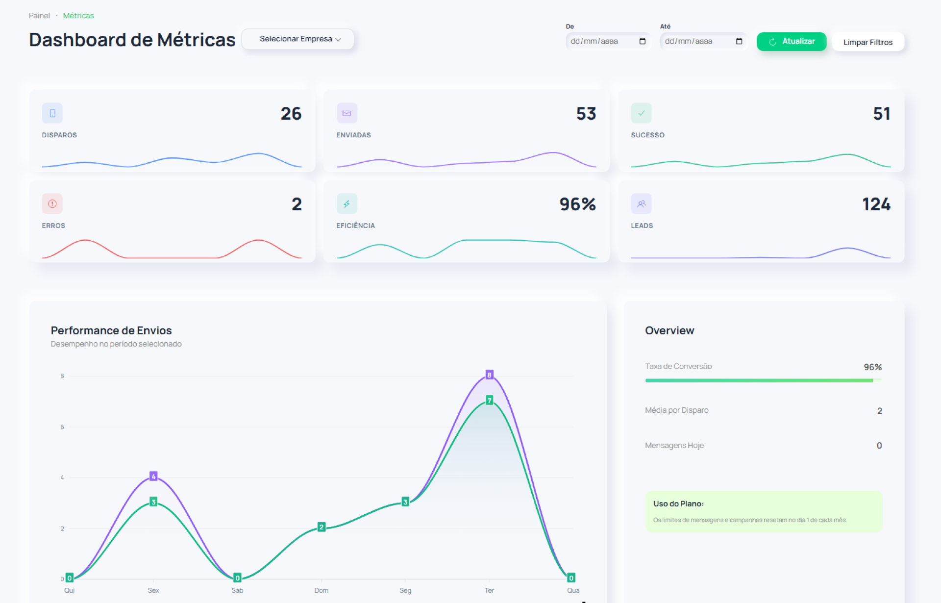 Envie campanhas, automatize o suporte e gerencie milhares de contatos sem precisar de um exército de atendentes. Seguro, rápido e escalável.